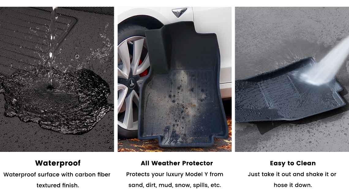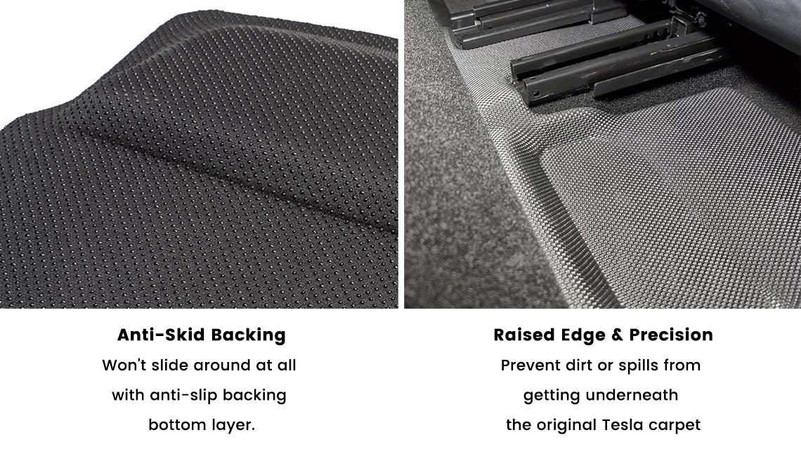 A: TAPTES floor mats will not only protect your Model 3's floor from sand, mud, snow, and dirt but also holding liquids when you accidentally splash drinks on the floor. Besides its strong all-weather protection, the custom-made floor mats for Model 3 also provide a comfortable feet rest while driving as an anti-fatigue car mat. Besides, only carpet floor mats come with your Model 3.
